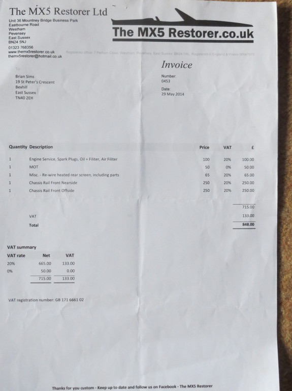 Substantial work carried out in 2014 by MX5 Restorer Ltd Pevensey, including Chassis Rail Front Nearside and Chassis Rail Front Offside