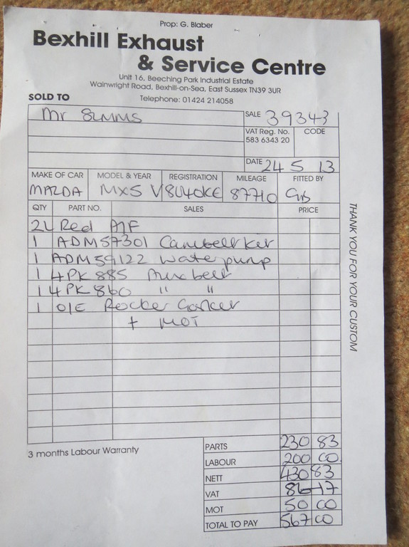 Substantial work carried out in 2013, including cam belt kit, water pump, aux belt, rocker gasket